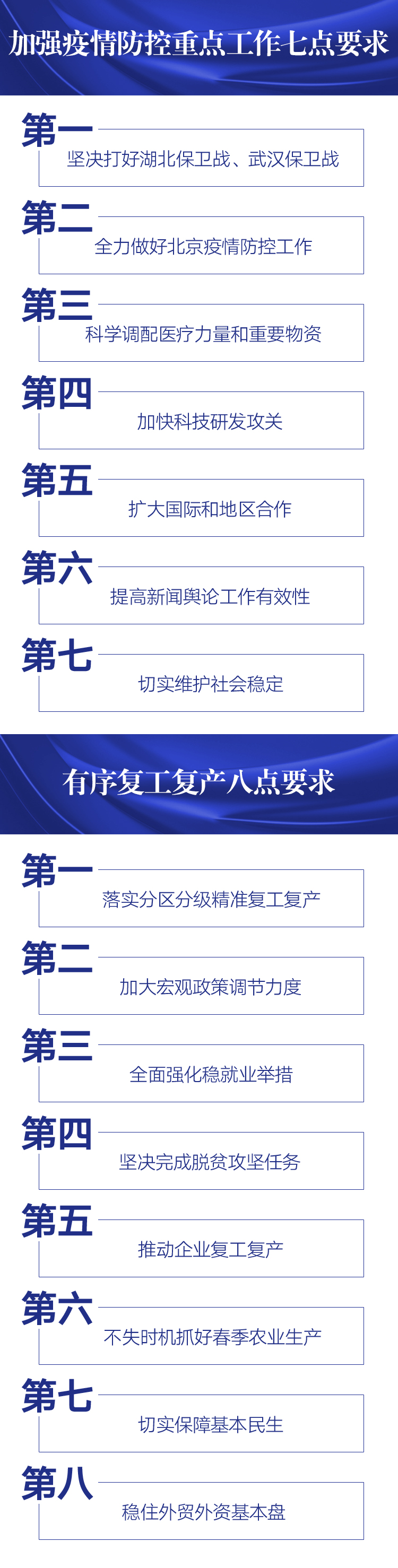 经济社会是一个动态循环系统,不能长时间停摆。疫情防控,丝毫不能松劲;经济社会发展,亦需统筹推进。辩证施政,两手都要抓,两手都要硬。在统筹推进新冠肺炎疫情防控和经济社会发展工作部署会议上,关于当前加强疫情防控重点工作,习近平提出了七点要求,又对有序复工复产提出八点要求。