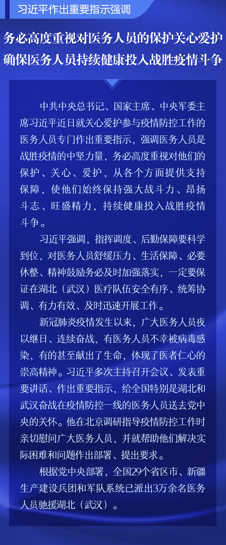 他专门就关心爱护参与疫情防控工作的医务人员作出重要指示,指挥调度、后勤保障要科学到位,对医务人员舒缓压力、生活保障、必要休整、精神鼓励务必及时加强落实,一定要保证在湖北(武汉)医疗队伍安全有序、统筹协调、有力有效、及时迅速开展工作。