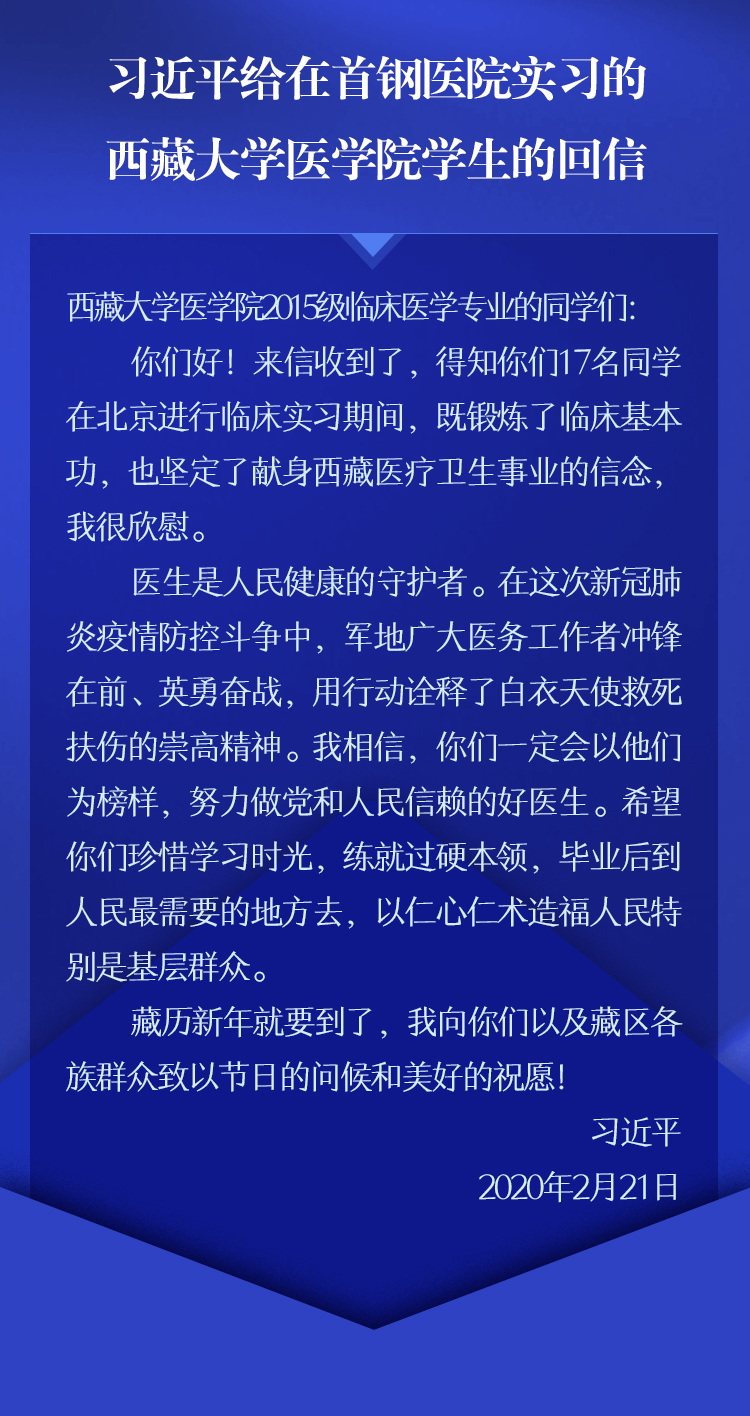 医者仁心,代代相传。疫情期间,习近平给在首钢医院实习的西藏大学医学院学生回信,勉励他们“珍惜学习时光,练就过硬本领,毕业后到人民最需要的地方去,以仁心仁术造福人民特别是基层群众”。