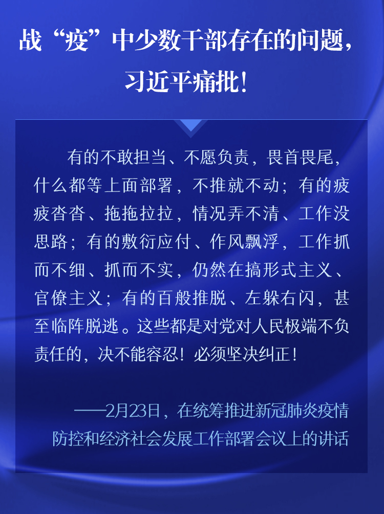 在统筹推进新冠肺炎疫情防控和经济社会发展工作部署会议上,习近平指出,各级党组织要在斗争一线考察识别干部,对表现突出的干部要大力褒奖、大胆使用,对不担当不作为、失职渎职的要严肃问责,对紧要关头当“逃兵”的要就地免职。