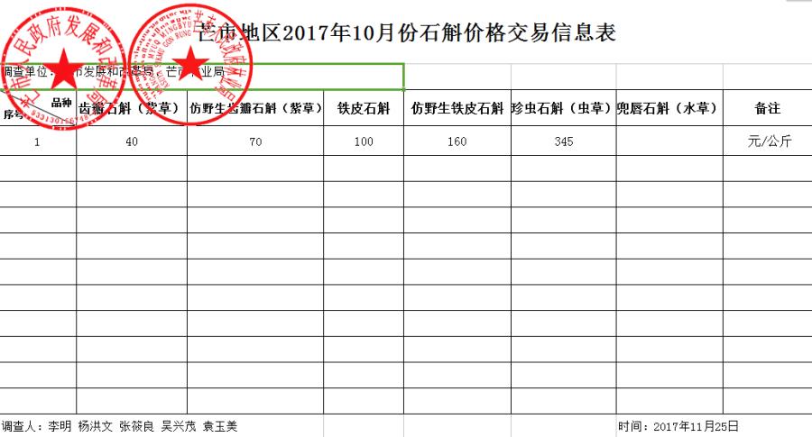 芒市地区2017年11月石斛价格交易信息表