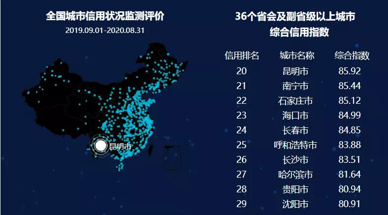 据2020年6-8月国家城市信用月报显示,在全国36个省会级副省级以上城市信用排名中,昆明市排名分别为第25、第22以及第20名,排名情况保持小幅度稳步提升。