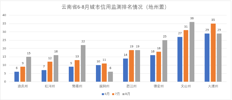 6-8月,全国40个(8月为38个)地州盟中,迪庆州、红河州、楚雄州、德宏州、文山州排名持续下滑;