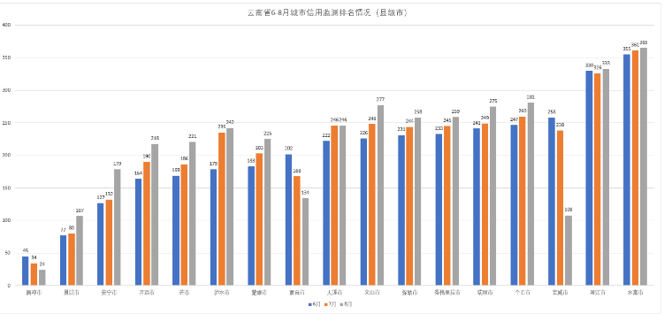 普洱市、曲靖市、丽江市、昭通市和玉溪市排名均有所提升,曲靖市提升尤为显著,8月较6月提升了43个名次,临沧市排名持续下降。