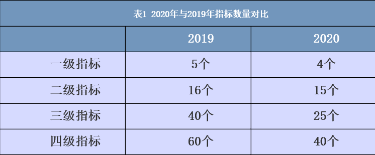 在二级指标中,相较2019年的二级指标,2020版删除10个指标,新增8个指标,调整4个指标,保留3个指标(详见表3)。