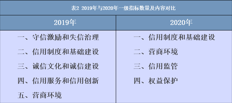新版指标的一级指标由2019年的5个缩减为4个。相较于2019年,2020年的一级指标中删除“守信激励和失信治理”、“诚信文化和诚信建设”与“信用服务和信用创新”,新增“信用监管”和“权益保护”(详见表2)。