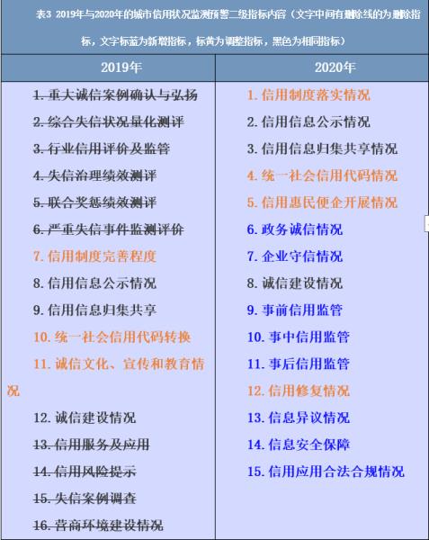 2020年8月,国家公共信用信息中心发布《城市信用状况监测预警指标(2020年版)》,与2019版相比,新版指标改动较大,主要包括以下几个方面: