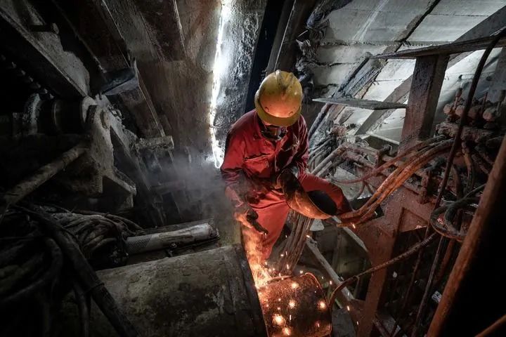 8月4日,在高黎贡山隧道内,掌子面施工人员进行焊接作业。新华社记者 王冠森 摄