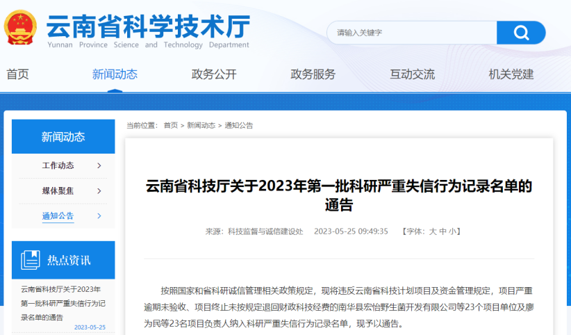 5月25日,云南省科技厅关于2023年第一批科研严重失信行为记录名单,共23个项目单位及23名项目负责人被纳入科研严重失信行为记录名单。