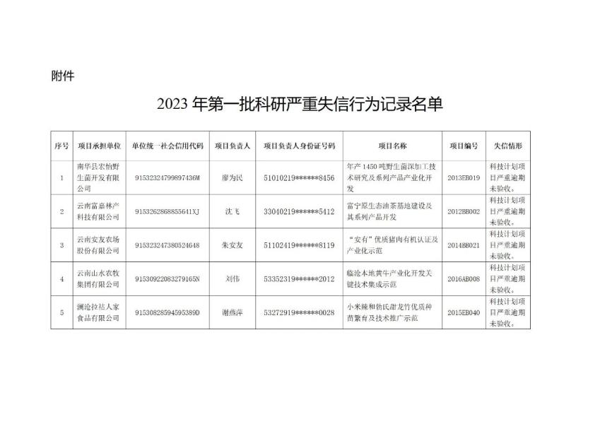 云南省科技厅关于2023年第一批科研严重失信行为记录