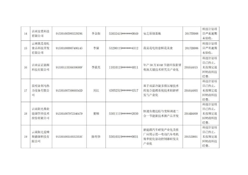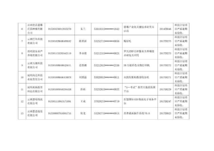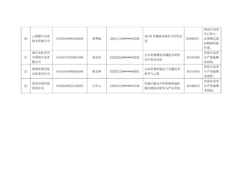 按照国家和省科研诚信管理相关政策规定,现将违反云南省科技计划项目及资金管理规定,项目严重逾期未验收、项目终止未按规定退回财政科技经费的南华县宏怡野生菌开发有限公司等23个项目单位及廖为民等23名项目负责人纳入科研严重失信行为记录名单,现予以通告。