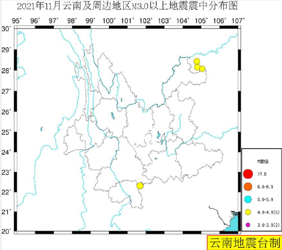 2021年11月云南及周边地震活动概况:云南及周边地区(北纬20°~30°,东经96°~107°)共发生地震1888次。按M统计,其中M2.0~2.9级56次、M3.0~3.9级7次、M4.0~4.9级6次,该区域最大地震为11月16日13时22分老挝M4.8级地震,省内最大地震为11月12日09时50分云南威信M4.3级地震。(注:M为国家标准震级)