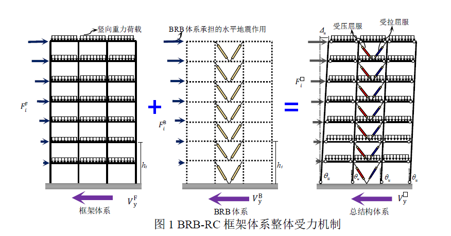防屈曲支撑(BRB)是一种高性能承载-耗能构件,将其应用于RC框架,可显著提升结构的抗震性能。当RC框架结构中添加BRB时,将对原结构产生附加的强度和刚度并形成双重抗侧力体系(见图1)。已有研究表明,合理设计防屈曲支撑-混凝土框架结构可以综合混凝土与钢材各自的优势,提高结构承载力,刚度以及延性性能。由于断层形成机制,近断层地震动中会产生长周期速度脉冲,近断层地震动的向前方向性效应和滑冲效应的速度脉冲会给工程结构输入很高的地震能量,对结构的抗震十分不利。因此,评估BRB分别在典型的向前方向性效应、滑冲效应以及非脉冲的近断层地震动作用下的受力性能,进一步了解BRB-RC结构在近断层地震动下的抗震性能十分重要。