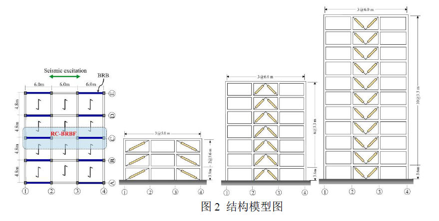 1)为全面了解BRB-RC抗震性能,通过不同BRB布置类型、不同结构总层数以及不同的设计侧力比三个方面建立了九幢BRB-RC结构(见图2)。研究了BRB-RC结构在36条近断层地震动(选取向前方向性效应、滑冲效应和无脉冲近场地震动各12条)下的地震响应,包括最大层间位移角、结构顶层加速度、结构顶层侧移以及BRB轴向性能。