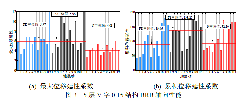 2)通过考察BRB在典型近断层地震动下的受力性能(见图3),表明BRB-RC框架体系无论在速度脉冲型还是非速度脉冲的近断层地震动作用下,BRB都能稳定发挥其耗能特性,提高结构体系的抗震性能。
