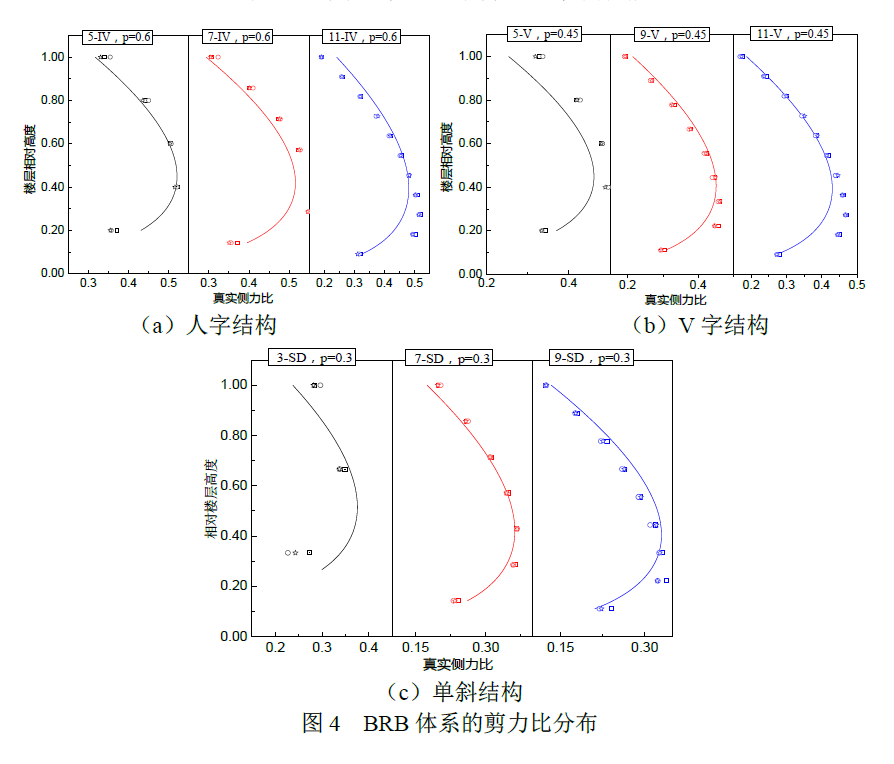 3)通过研究BRB-RC框架结构在近场地震动下的抗震响应,所提出的BRB承担的真实侧力比表达式,能量化BRB的设计剪力比、结构周期、结构层数等参数和真实侧力比之间的关系,建议BRB-RC框架结构抗震设计时BRB承担的剪力比可取为0.3-0.5(见图4)。
