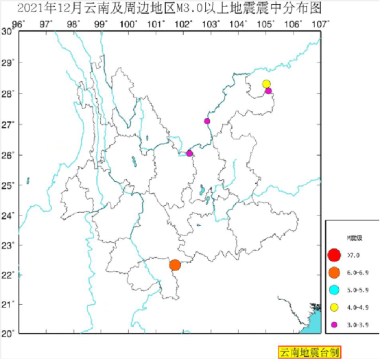 2021年12月云南及周边地震活动概况:云南及周边地区(北纬20°~30°,东经96°~107°)共发生地震2378次。按M统计,其中M2.0~2.9级73次、M3.0~3.9级12次、M4.0~4.9级5次、M5.0~5.9级1次、M6.0~6.9级1次,该区域最大地震为12月24日21时43分老挝M6.0级地震,省内最大地震为12月24日15时58分云南武定M3.2级地震。(注:M为国家标准震级)