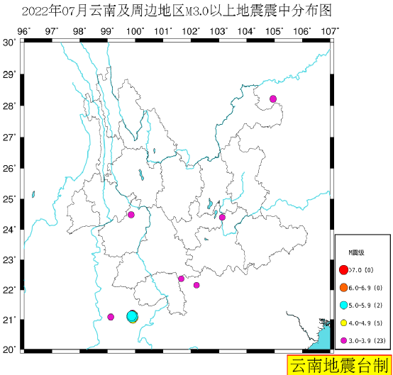 2022年07月云南及周边地震活动概况:云南及周边地区(北纬20°~30°,东经96°~107°)共发生地震1627次。按M统计,其中M2.0~2.9级107次、M3.0~3.9级23次、M4.0~4.9级5次、M5.0~5.9级2次,该区域最大地震为07月22日01时07分缅甸M5.9级地震,省内最大地震为07月26日07时58分云南凤庆M3.3级地震。(注:M为国家标准震级)