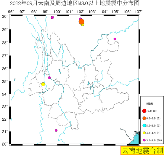 2022年09月云南及周边地震活动概况:云南及周边地区(北纬20°~30°,东经96°~107°)共发生地震1346次。按M统计,其中M3.0~3.9级20次、M4.0~4.9级3次、M6.0~6.9级1次,该区域最大地震为09月05日12时52分四川泸定M6.8级地震,省内最大地震为09月23日10时47分云南龙陵M4.5级地震。(注:M为国家标准震级)