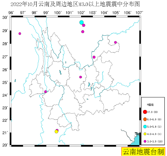 2022年10月云南及周边地震活动概况:云南及周边地区(北纬20°~30°,东经96°~107°)共发生地震1423次。按M统计,其中M3.0~3.9级10次、M4.0~4.9级1次、M5.0~5.9级1次,该区域最大地震为10月22日13时17分四川泸定M5.0级地震,省内最大地震为10月04日07时19分云南巧家M3.4级地震。(注:M为国家标准震级)