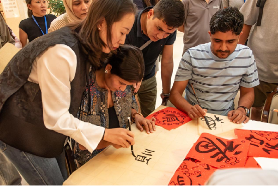 9月7日晚,中方人员向学员们展示了传统书法和茶艺表演,现场气氛热烈活跃,学员兴趣浓厚,主动尝试了书法写作。“我爱中国”、“中国人民是善良的人民”,学员自发书写了自己对中国的真挚情谊。应学员提议,课间休息时,中方人员组织学员学习中文,练习中国养身气功“八段锦”,广受学员欢迎。