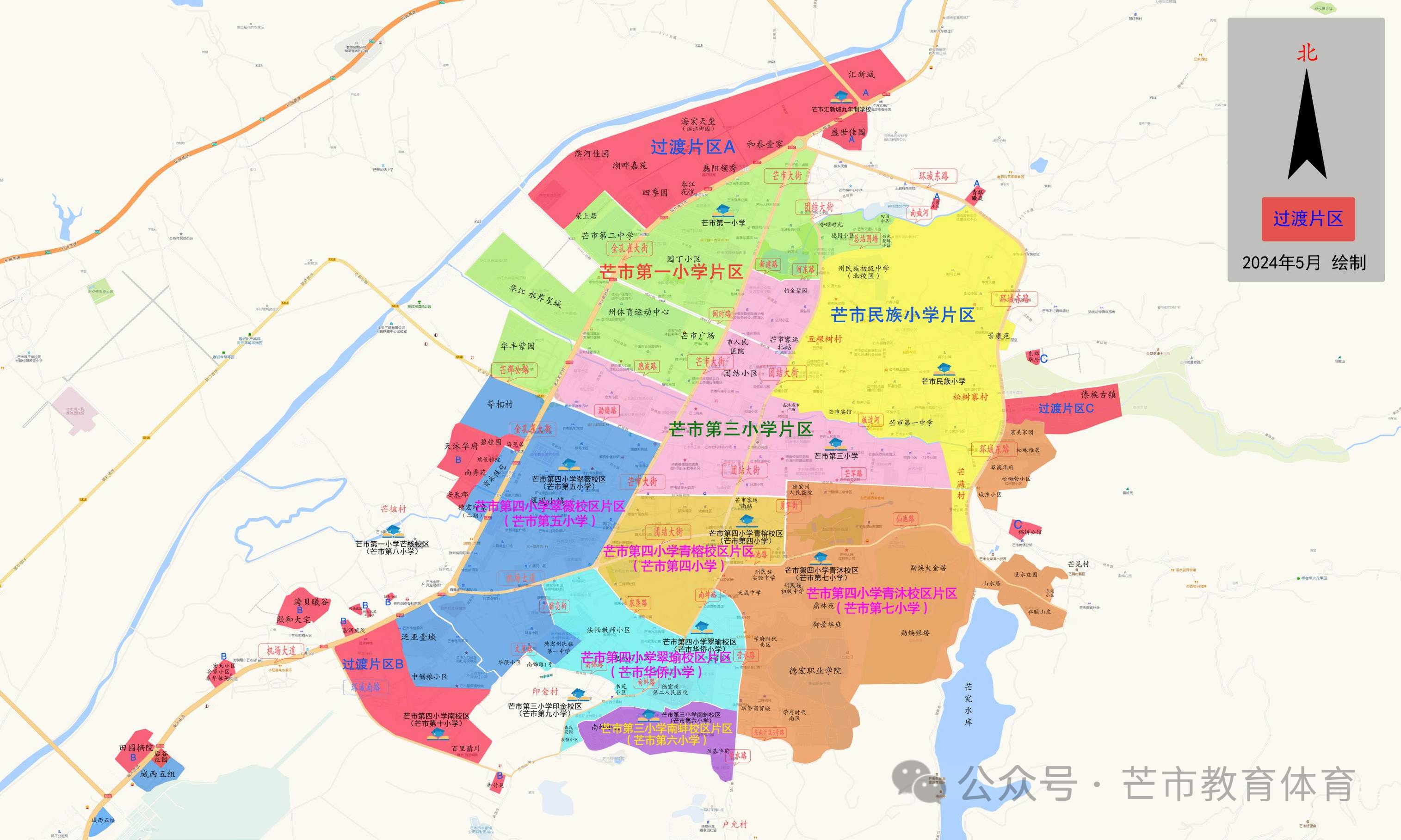 根据芒市城区建成区、人口密度、学校布局和办学条件,划分11个招生片区和2个过渡片区,即芒市第一小学片区、芒市民族小学片区、芒市第三小学片区、芒市第四小学青榕校区(芒市第四小学)片区、芒市第四小学翠微校区(芒市第五小学)片区、芒市第三小学南蚌校区(芒市第六小学)片区、芒市第四小学青沐校区(芒市第七小学)片区、芒市第一小学芒核校区(芒市第八小学)片区、芒市第三小学印金校区(芒市第九小学)片区、芒市第四小学翠瑜校区(芒市华侨小学)片区、芒市第一小学汇新学校片区和B、C二个过渡片区。除第八、第九小学外,招生片区以芒市城区小学招生片区图为准。