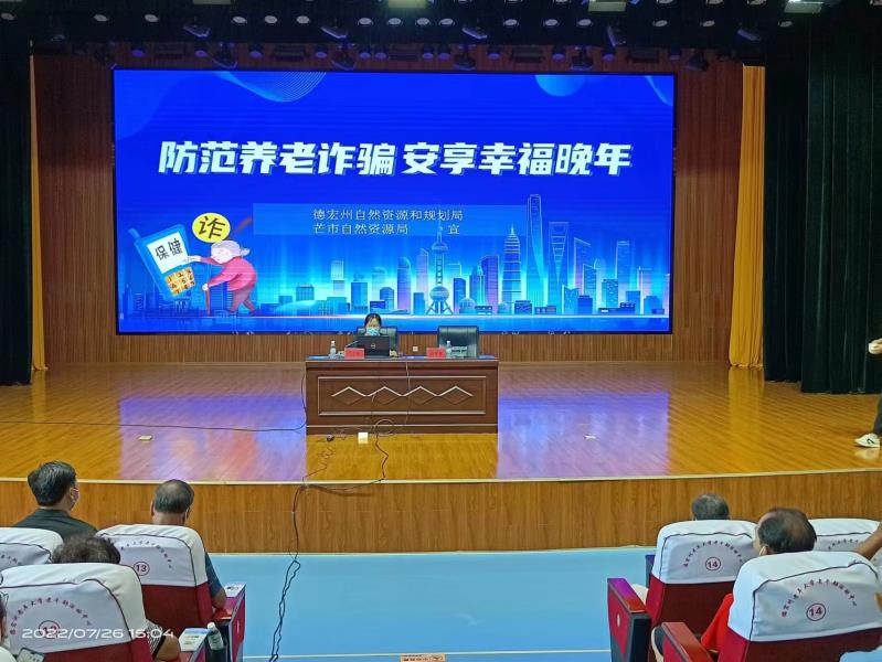 为打击整治养老诈骗行为,切实维护老年人合法权益,近日,芒市自然资源局配合州自然资源和规划局到德宏州老年大学进行“防范养老诈骗安享幸福晚年”宣讲活动,开展坚决打击整治自然资源领域养老诈骗专项行动宣传,州自然资源和规划局左安慈通过图文并茂、通俗易懂的语言生动描述和观看防骗视频等多种方式对老年人认真讲解什么是以房养老等七类典型养老骗局,重点讲解打击整治养老诈骗专项行动,提高老年人警惕性,教大家如何保护好自己晚年的钱袋子。
