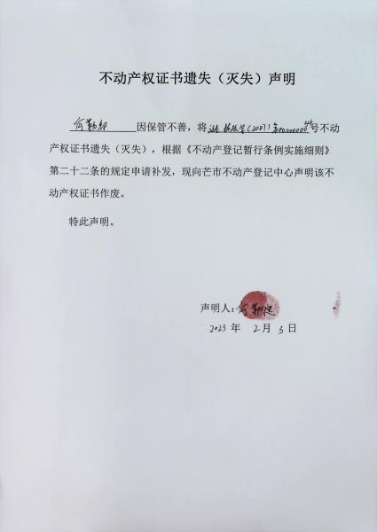 何勒都 因保管不善,将 潞林政字(2007)第0000000034号不动产权证书遗失(灭失),根据《不动产登记暂行条例实施细则》第二十二条的规定申请补发,现声明该不动产权证书作废。如有异议自公告之日起15个工作日内向我登记中心书面提出,无异议的,我登记中心将向权利人补发《不动产权证书》。