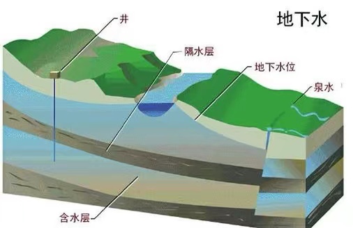 地下水,是指赋存于地面以下岩石空隙中的水,狭义上是指地下水面以下饱和含水层中的水。国外学者认为地下水的定义有三种:一是指与地表水有显著区别的所有埋藏在地下水的水,特指含水层中饱水带的那部分水;二是向下流动或渗透,使土壤和岩石饱和,并补给泉和井的水;三是在地下的岩石空洞里、在组成地壳物质的空隙中储存的水。在国家标准《水文地质术语》(GB/T14157-93)中,埋藏于地表以下的各种形式的重力水被定义为地下水。