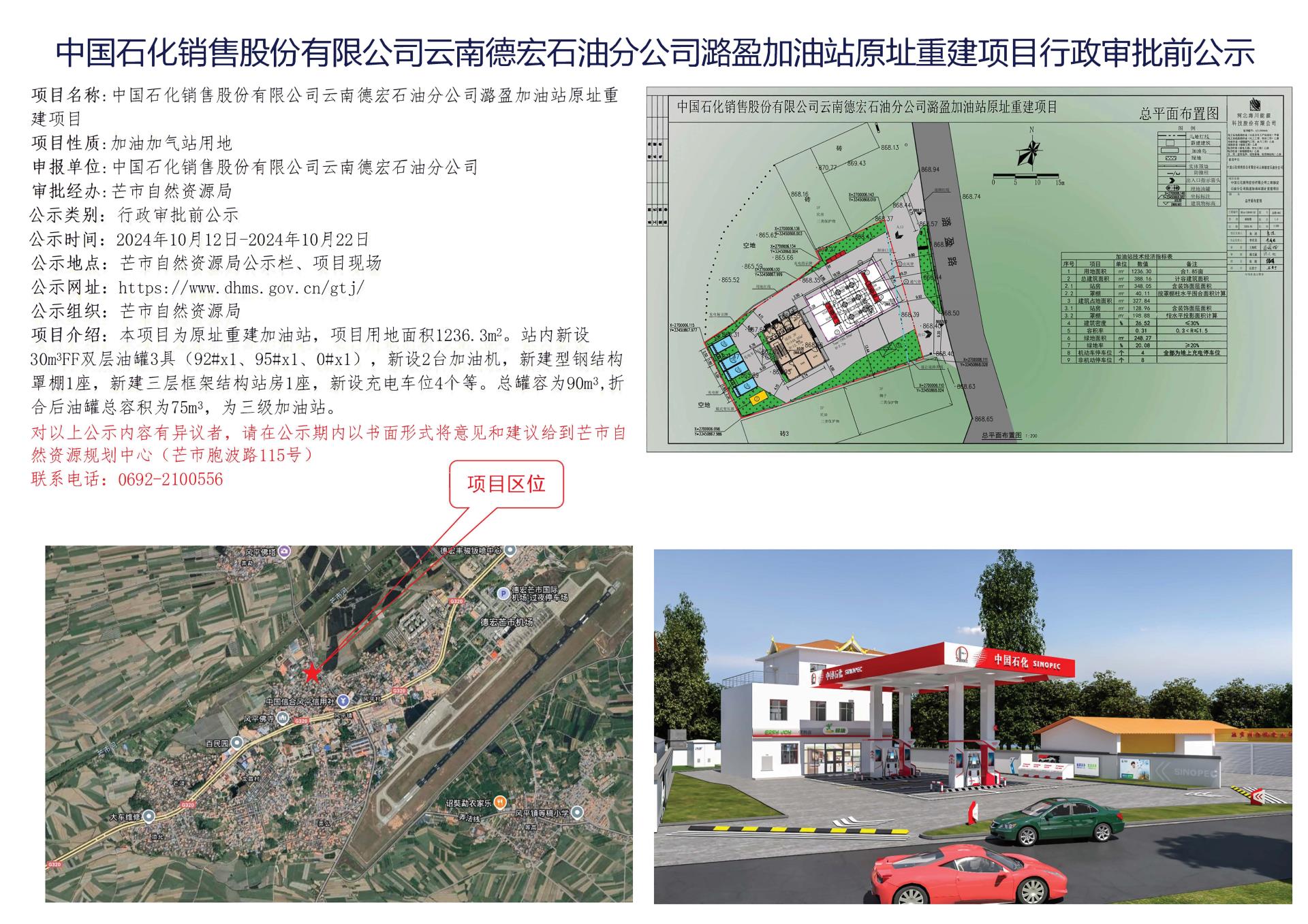 中国石化销售股份有限公司云南德宏石油分公司潞盈加油站原址重建项目行政审批前公示2024.10.12-2024.10.22