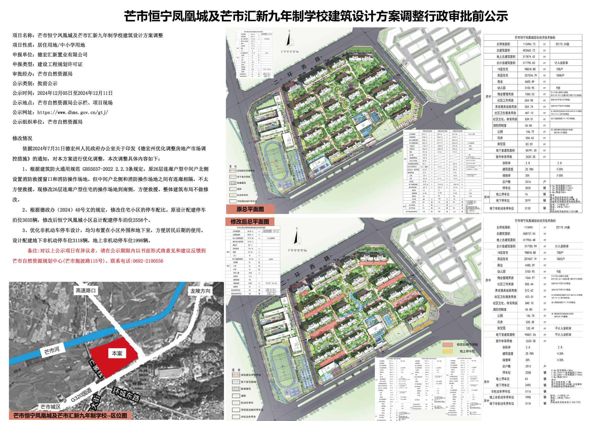 芒市恒宁凤凰城及芒市汇新九年制学校建筑设计方案调整行政审批前公示2024.12.05-2024.12.11