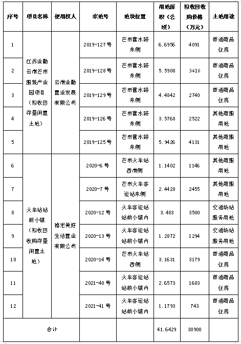 根据《自然资源部关于运用地方政府专项债券资金收回收购存量闲置土地的通知》(自然资发〔2024〕242号)、《云南省自然资源厅关于做好收回收购闲置存量土地和新增土地储备专项债券项目申报前期工作的通知》等文件要求,经芒市自然资源局2025年第2次领导班子会议审议并与土地使用权人协商一致后,确定芒市2025年第一批拟收回收购的存量闲置土地项目及拟收回收购价格,现将有关信息予以公示: