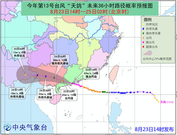今年第13号台风“天鸽”(强台风级)已于23日12时50分前后在广东省珠海市南部沿海登陆,登陆时中心附近最大风力14级(45米/秒),中心最低气压950百帕。