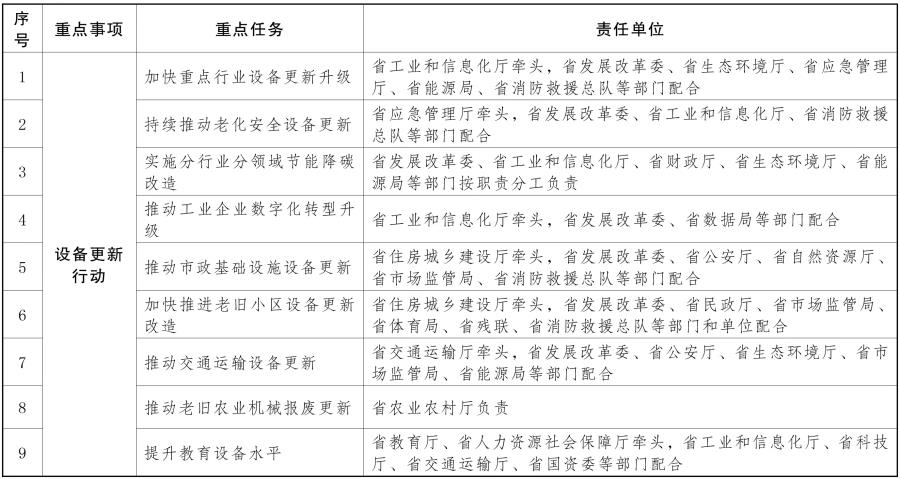 1.加快重点行业设备更新升级。聚焦石化、化工、钢铁、有色、建材、煤炭、电力、机械、轻纺、电子等重点行业,制定涵盖先进设备更新、数字化转型、绿色装备推广、本质安全水平提升的全省工业领域综合性工作方案。大力推进重点行业节能降碳、超低排放、安全生产、数字化转型、智能化升级,有序推进工业领域生产设备、用能设备、发输配电设备、环保设备、检验检测设备等更新和技术改造。