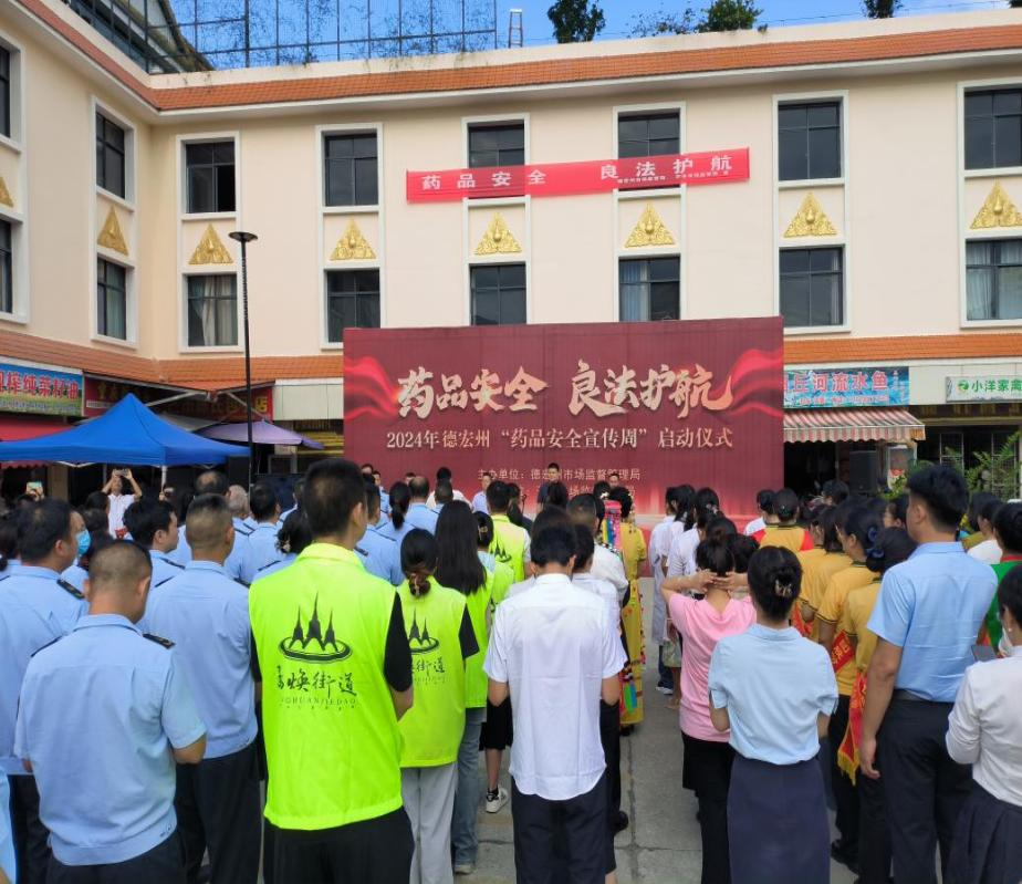 启动仪式由德宏州市场监督管理局主办、芒市市场监督管理局承办,仪式上,芒市人民政府副市长胡锐向莅临现场的来宾致辞;州人民政府副秘书长尹志邦讲话并宣布德宏州 2024年“药品安全宣传周”活动启动;药品经营企业代表云南省医药德宏发展有限公司和云南健之佳健康药房有限公司德宏分部做了交流发言。德宏州和芒市市场监管局领导及相关工作人员、德宏州检验检测院、德宏州药品不良反应监测中心、芒市卫生健康局、芒市公安局、芒市教育体育局、芒市医疗保障局、芒市勐焕街道办事处等有关领导,以及芒市药品、医疗器械和化妆品经营使用单位代表、相关新闻媒体等参加了启动仪式。身穿德宏州傣族、景颇族、阿昌族等五种少数民族服装的德宏州药品不良反应监测中心工作人员和部分药品经营单位代表齐聚活动现场,各民族积极参与药品安全宣传周活动。