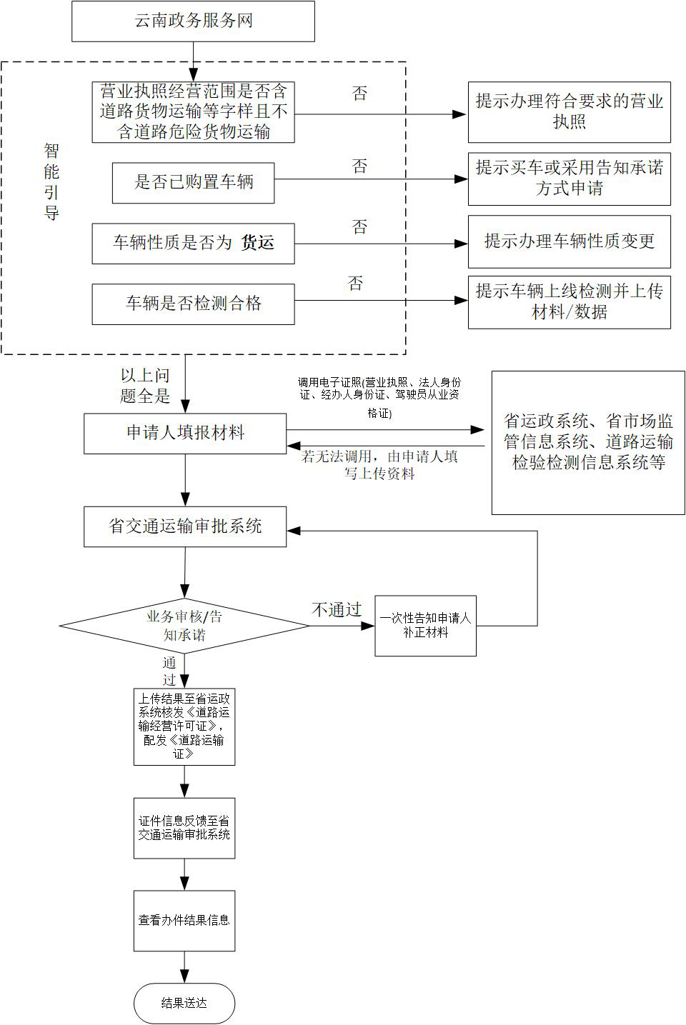 3.涉及事项:企业营业执照信息核验、道路货物运输经营许可(危险货物道路运输经营、使用总质量4500千克及以下普通货运车辆从事普通货运经营的除外)、普通道路货物运输车辆《道路运输证》办理(属于道路货物运输经营许可的从属事项)。