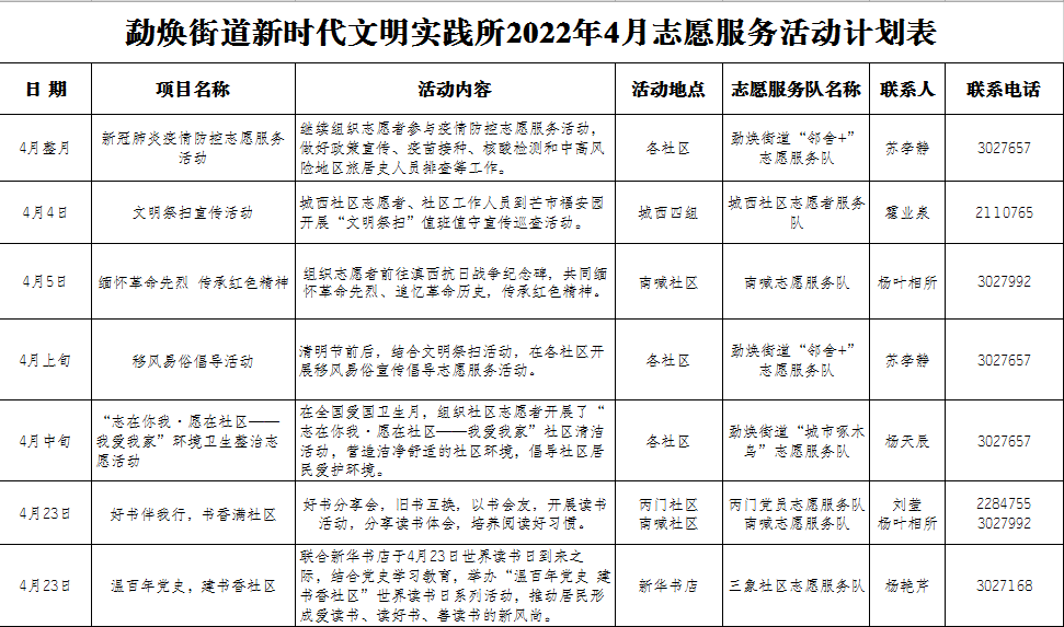 勐焕街道新时代文明实践所2022年4月志愿服务活动计划表