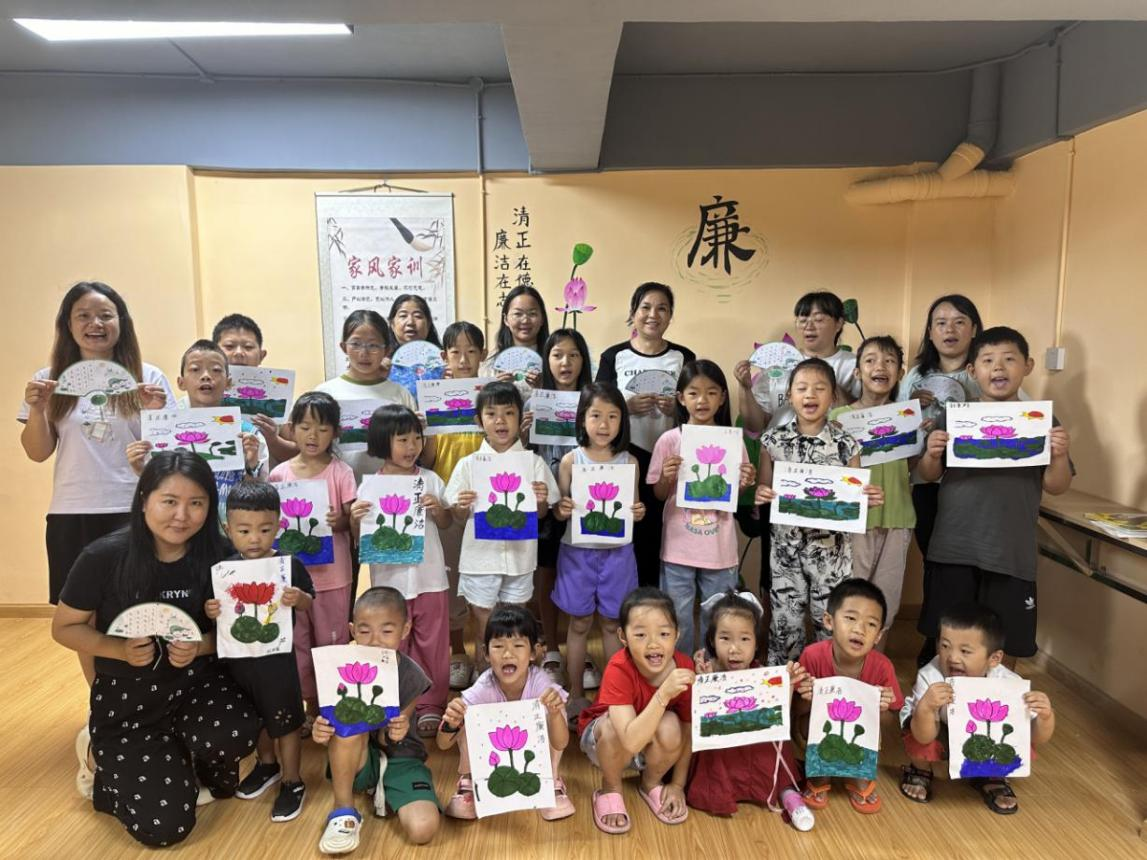活动开始,以通俗易懂的方式向青少年们阐述了廉洁的重要性,并通过观看《子罕不受玉》和讲述身边的廉洁故事,引导孩子们分享了自己知道的廉洁故事和廉洁榜样。接下来,在绘画环节中,孩子们充分发挥想象力,拿起画笔,将清廉元素融入绘画中,表达自己对“廉洁”的理解。在一小时的绘画时间里,一幅幅充满童趣和寓意深刻的廉洁画作相继完成,传递着向上向善的清廉正能量。这些画作中,清廉的莲花、苍劲有力的“廉”字相互映衬,发挥廉洁文化的教育激励作用,帮助孩子们从小牢固树立廉洁价值理念。