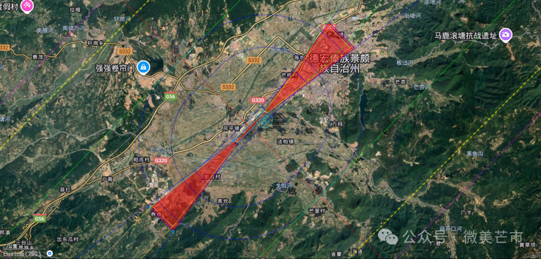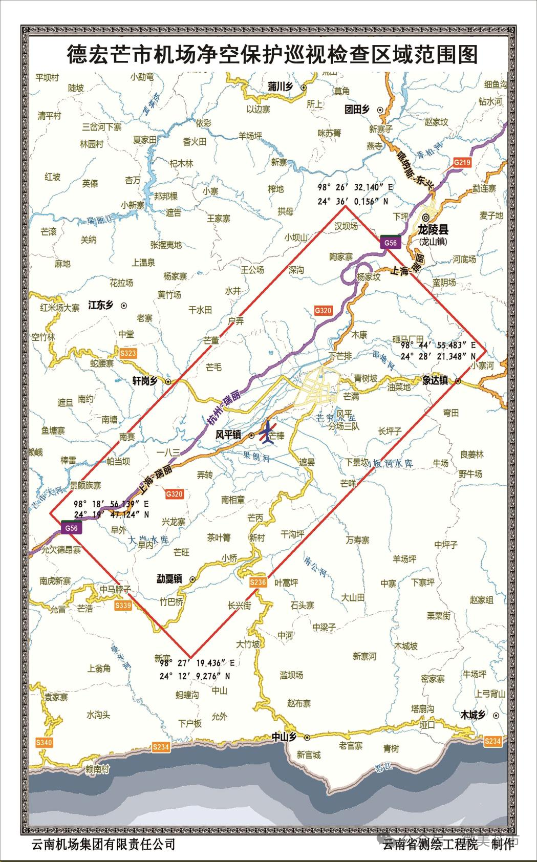 机场净空保护区是指为保障航空器起飞、降落安全,按照民航技术标准划定的空间范围。德宏芒市国际机场净空保护区的范围是以机场为圆心半径55公里的区域。净空巡视检查区域为机场跑道中心线两侧各10公里,跑道端外各20公里的长方形区域,其四至界限如下:北至桦桃国有林,南至三台山乡勐丹村民委员会,东至勐旺国有林,西至轩岗乡芒广村民委员会,包括勐焕街道、芒市镇、风平镇、轩岗乡、三台山乡等。