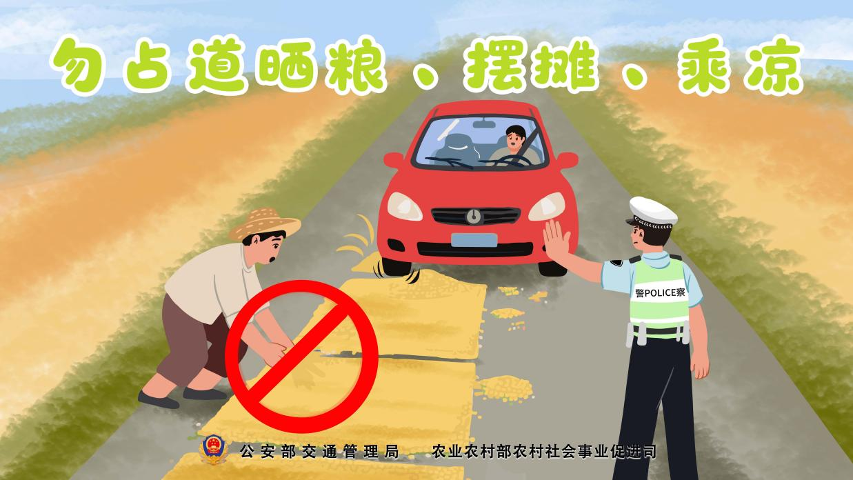 占用道路晾晒粮的行为存在较大安全隐患,一是挤占道路通行空间,加剧通行冲突,极易引发刮擦、碰撞等交通事故。二是粮食颗粒附着在路面,会大幅降低路面摩擦系数,增加追尾、侧翻等制动风险。三是违规设置障碍物,形成安全盲区,大大增加了车辆失控和碰撞风险。四是粮食颗粒反光易造成驾驶人“眩光”,干扰驾驶人视线,影响操作判断。五是现场人员防护缺失,过往车辆因避让粮食或障碍物,易与现场人员发生碰撞,一旦发生事故,往往造成人员受伤甚至更严重后果。