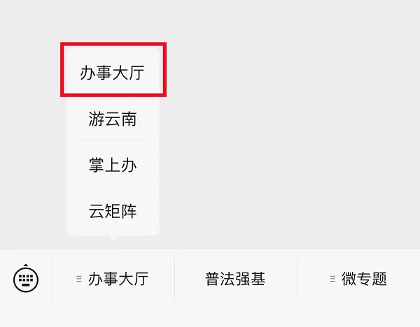 关注“云南发布”微信公众号,点击进入菜单栏“办事大厅”。