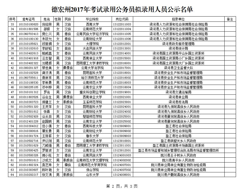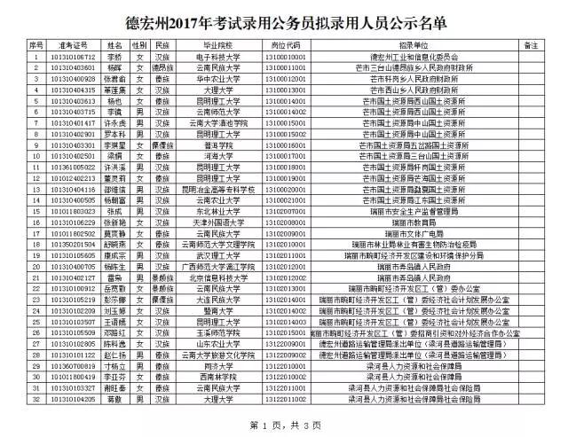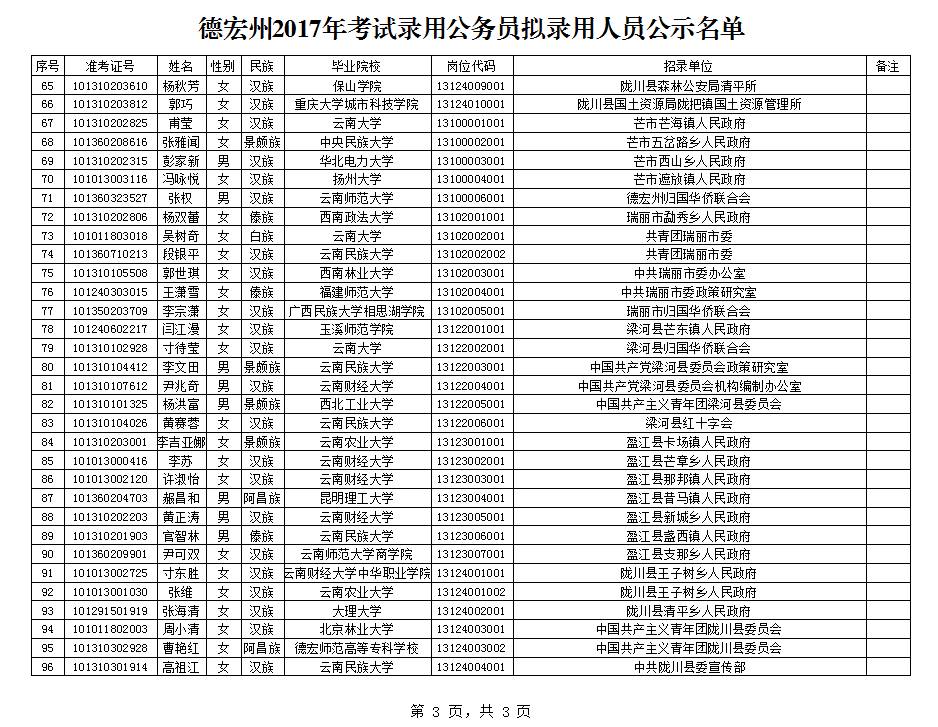根据中共云南省委组织部、云南省人力资源和社会保障厅、云南省公务员局《云南省2017年度考试录用公务员公告》规定,经笔试、体能测评、面试、体检、考察合格,现将德宏州2017年考试录用公务员拟录用人员(名单附后)予以公示,公示期为2017年9月4日至2017年 9月8日。