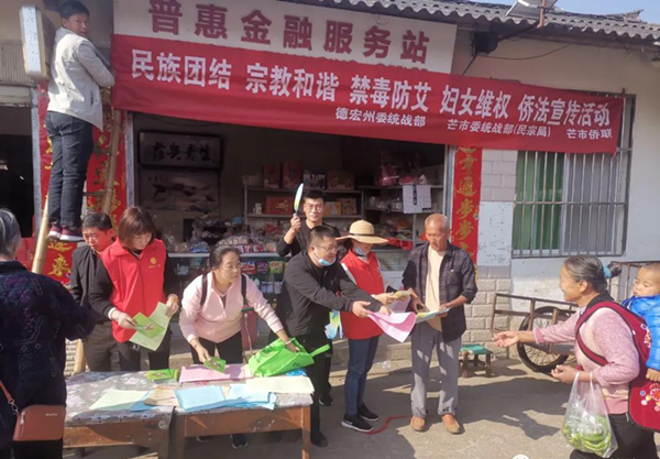 3月12日,德宏州委统战部、芒市委统战部(民宗局)、芒市侨联在勐嘎镇勐旺村组织开展民族团结、宗教和谐、禁毒防艾、妇女维权、侨法宣传活动,旨在让更多群众了解我州统一战线工作,积极参与到全国民族团结进步示范州创建工作中,铸牢中华民族共同体意识;引导好信教群众遵守宗教事务法律法规,确保宗教和顺、社会稳定;大力宣传侨法、妇女权益保障法、反家庭暴力法等,营造“知法、懂法、用法的良好氛围,让妇女同胞、广大侨胞合法权益得到有效维护;让“无毒青春、健康生活”深入青少年心里,提高公民禁毒意识和抵抗力,防止青少年毒品问题的蔓延,真正远离毒品。