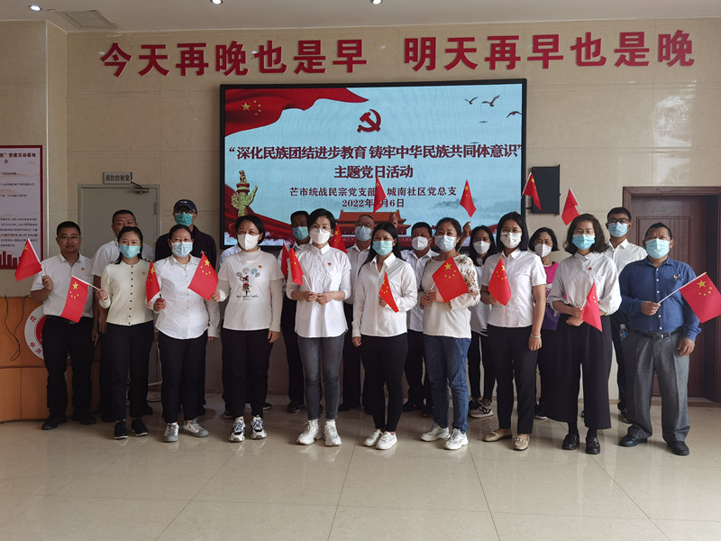 为深化民族团结进步和中华民族共同体宣传教育,自2020年来,党支部将每年的5月6日确定为本单位的民族团结进步学习宣传日。5月6日,芒市统战民宗党支部和城南社区党总支如期开展“ 铸牢中华民族共同体意识”主题党日活动。活动通过“十二个一”规定动作完成了学习宣传任务。