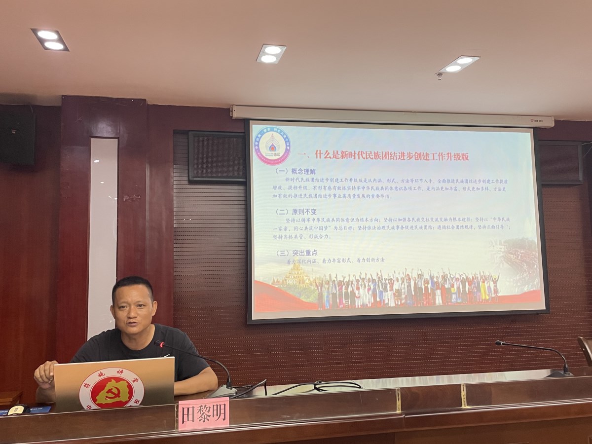 德宏州铸牢中华民族共同体意识研究中心工作人员田黎明以“紧扣铸牢中华民族共同体意识主线、打造新时代民族团结进步创建工作升级版”为题作专业辅导,说清讲明打造创建工作升级版要如何着力深化内涵、丰富形式和创新方法,结合最新的示范创建测评指标,对申报示范单位工作进行具体讲解和指导,对整体推进创建工作升级版提出了建设性建议。