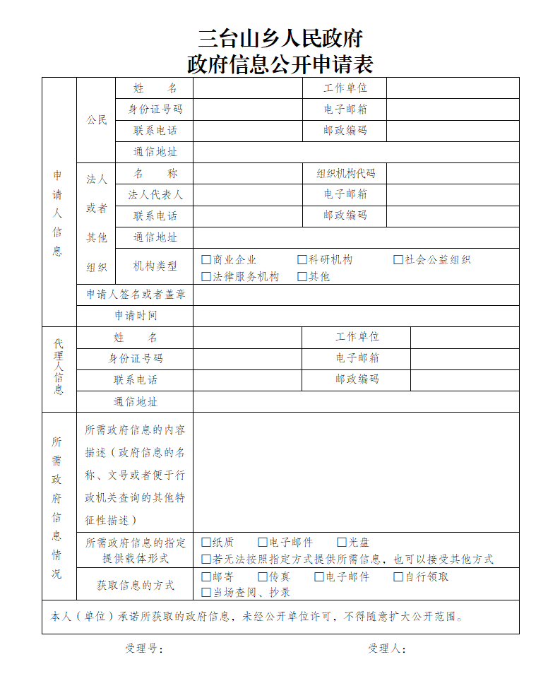 申请人须填写《三台山乡政府信息公开申请表》,可在芒市三台山乡信息公开专栏下载电子版本(附件1:三台山乡政府信息公开申请表),复制有效;不具备下载条件的,可向受理机构申请领取。