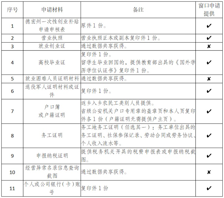 德宏州人民政府办公室关于印发《德宏州实施就业创业“引凤计划”五条措施》的通知(德政办发〔2025〕18号)规定,对首次创业(在德宏州内办理营业执照或其他法定注册登记手续)创办企业、个体工商户或农民专业合作社,并依法申报纳税的离校2年内高校毕业生、就业困难人员、返乡入乡农民工、退役军人,正常运营6个月以上的(自工商登记注册之日起,下同),州级财政给予一次性创业补贴0.5万元;正常运营12个月以上的,通过就业补助资金给予0.5万元一次性创业补贴。