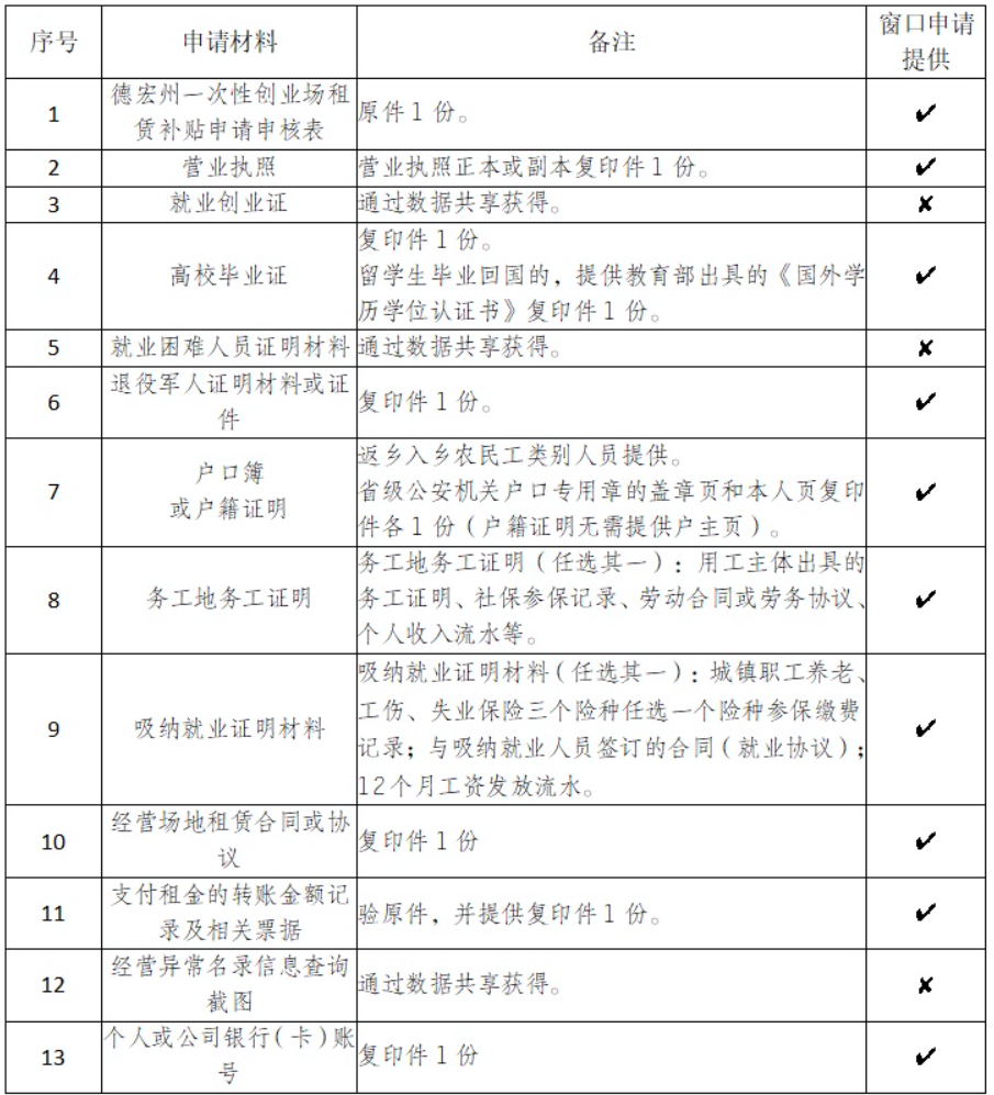 德宏州人民政府办公室关于印发《德宏州实施就业创业“引凤计划”五条措施》的通知(德政办发〔2025〕18号)规定,对离校2年内高校毕业生、就业困难人员、返乡入乡农民工、退役军人,在德宏州辖区内创办小微企业、个体工商户(2025年5月1日后登记注册),租用独立经营场地,正常经营12个月以上,未入驻政府认定的创业载体(含青年创业园)且吸纳就业3人及以上的,州级财政给予一次性创业场所租赁补贴,按实际租赁费用最高补助0.5万元;吸纳就业6人及以上的,州级财政给予一次性创业场所租赁补贴,按实际租赁费用最高补助0.8万元。