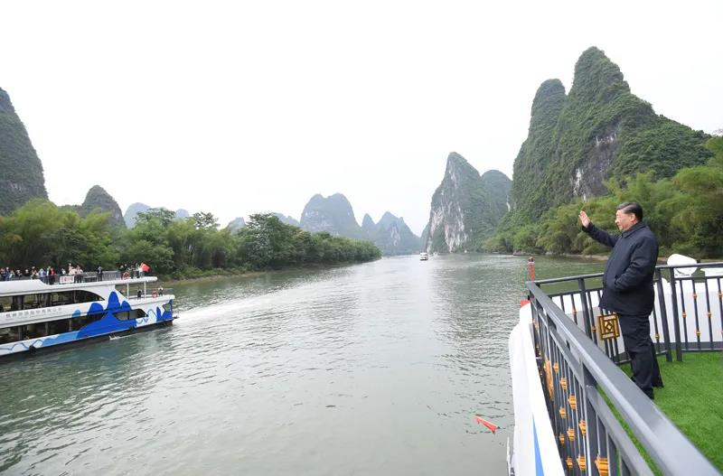 4月25日至27日,中共中央总书记、国家主席、中央军委主席习近平在广西考察。这是25日下午,习近平在桂林市阳朔县,乘船考察漓江阳朔段。新华社记者 鞠鹏 摄