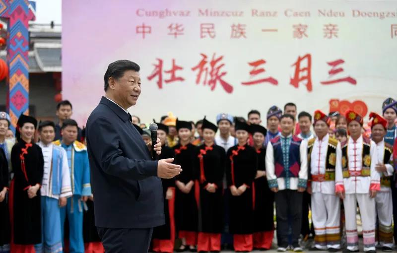 广西是我国少数民族人口最多的自治区。27日上午,习近平来到位于南宁市邕江之畔的广西民族博物馆,参观壮族文化展。博物馆外,三月三“歌圩节”壮族对歌等民族文化活动正在这里集中展示。习近平强调,广西是全国民族团结进步示范区,要继续发挥好示范带动作用。各民族共同团结进步、共同繁荣发展是中华民族的生命所在、力量所在、希望所在,在全面建设社会主义现代化国家新征程上,一个民族都不能少,各族人民要心手相牵、团结奋进,共创中华民族的美好未来,共享民族复兴的伟大荣光。